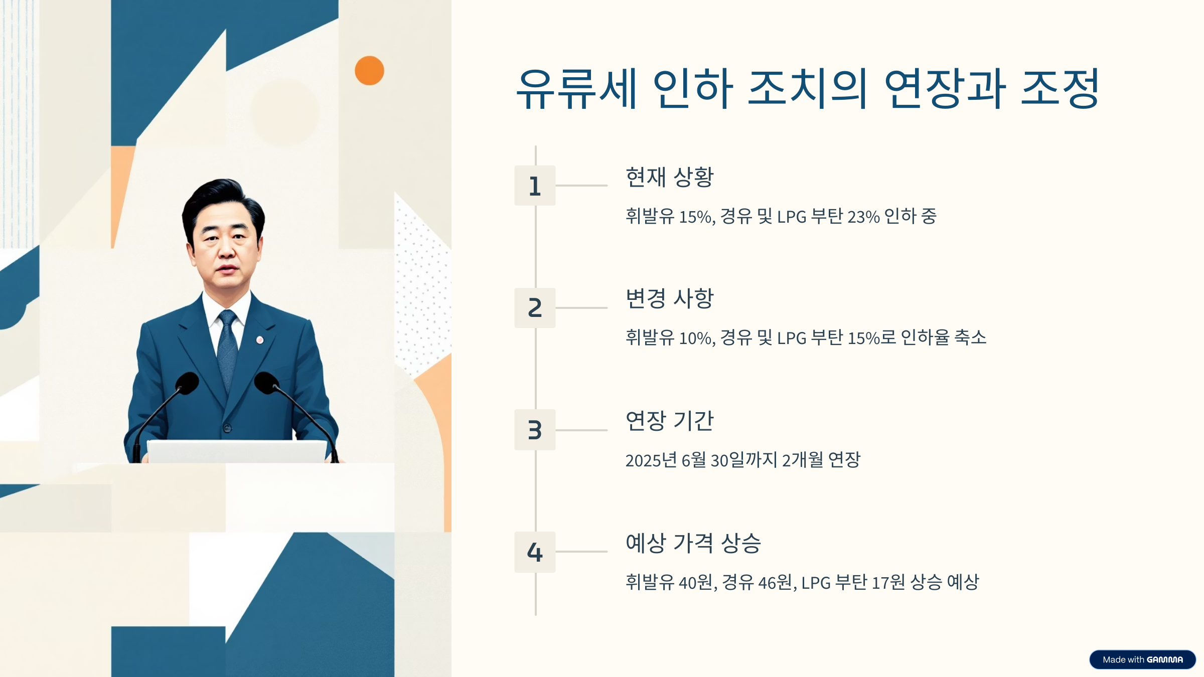 정부는 2025년 4월 22일, 이달 말 종료 예정이었던 유류세 한시적 인하 조치를 6월 30일까지 2개월 연장한다고 발표했습니다. 그러나 인하율은 조정되어 휘발유는 기존 15%에서 10%로, 경유 및 LPG 부탄은 23%에서 15%로 축소됩니다.