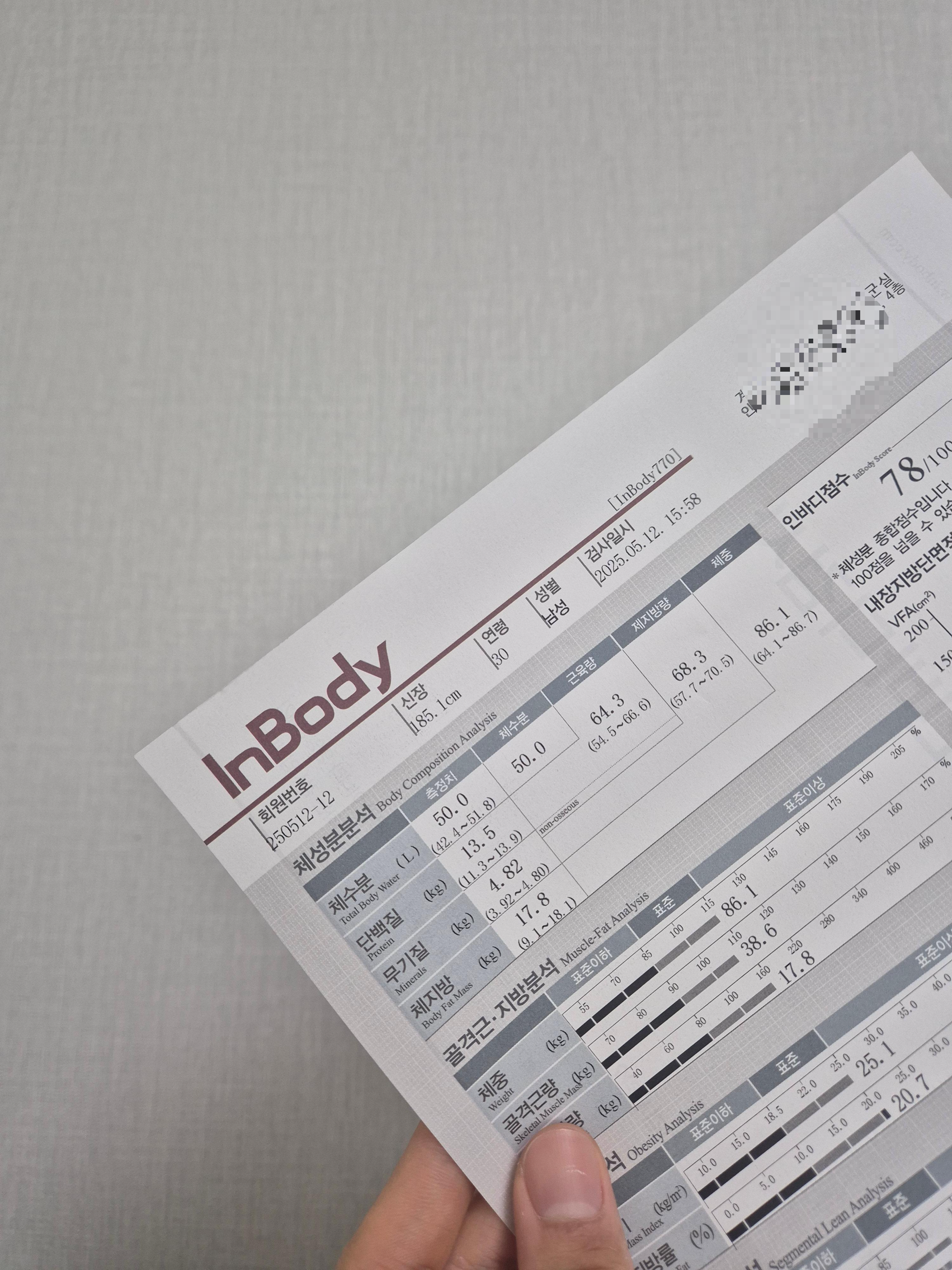 | 체중 | 86.1 kg | 64.1 ~ 86.1 kg | ✅ 정상 – 전체적으로 균형 잡힌 체형 |